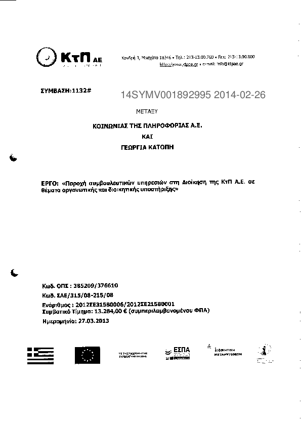 1. Παροχή συμβουλευτικών υπηρεσιών στη Διοίκηση της ΚτΠ Α.Ε. σε θέματα οργανωτικής και διοικητικής υποσ