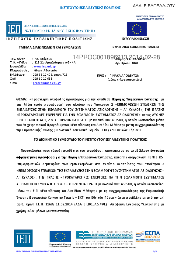 1. Πρόσκληση υποβολής προσφοράς για την ανάθεση Παροχής Υπηρεσιών Εστίασης (με την λήψη τριών προσφορών) στο πλαίσιο του Υποέργου 2 «ΕΠΙΜΟΡΦΩΣΗ ΣΤΕΛΕΧΩΝ ΤΗΣ ΕΚΠΑΙΔΕΥΣΗΣ ΣΤΗΝ ΕΦΑΜΡΟΓΗ ΤΟΥ ΣΥΣΤΗΜΑΤΟΣ ΑΞΙΟΛΟΓΗΣΗΣ – Α΄ ΚΥΚΛΟΣ», ΤΗΣ ΠΡΑΞΗΣ «ΠΡΟΚ...