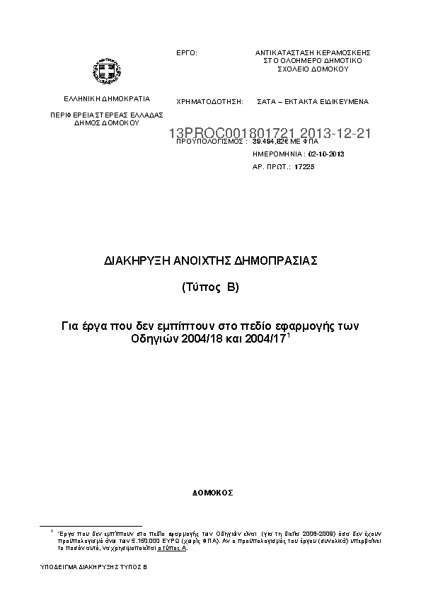 3. ΔΙΑΚΗΡΥΞΗ ΑΝΟΙΧΤΗΣ ΔΗΜΟΠΡΑΣΙΑ ΓΙΑ ΤΟ ΕΡΓΟ ΑΝΤΙΚΑΤΑΣΤΑΣΗ ΚΕΡΑΜΟΣΚΕΠΗΣ ΣΤΟ ΟΛΟΗΜΕΡΟ ΔΗΜΟΤΙΚΟ ΣΧΟΛΕΙΟ Δ