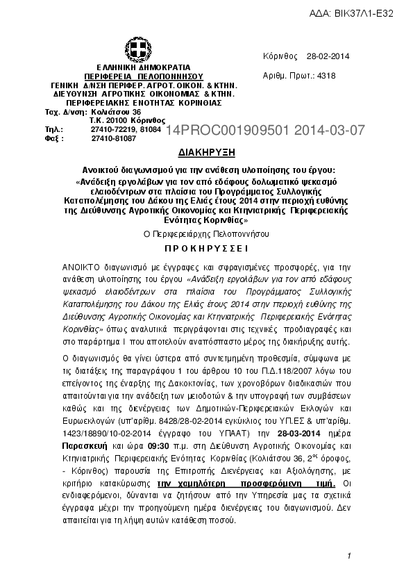 3. ΔΙΑΚΗΡΥΞΗΑνοικτού διαγωνισμού για την ανάθεση υλοποίησης του έργου:«Ανάδειξη εργολάβων για τον από εδάφους δολωματικό ψεκασμόελαιοδέντρων στα πλαίσια του Προγράμματος ΣυλλογικήςΚαταπολέμησης του Δάκου της Ελιάς έτους 2014 στην περιοχή ευ...