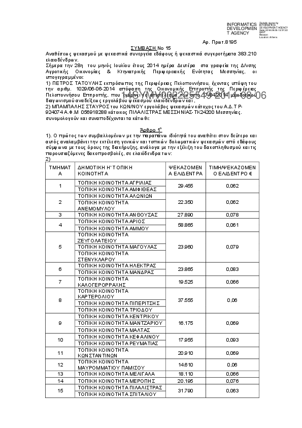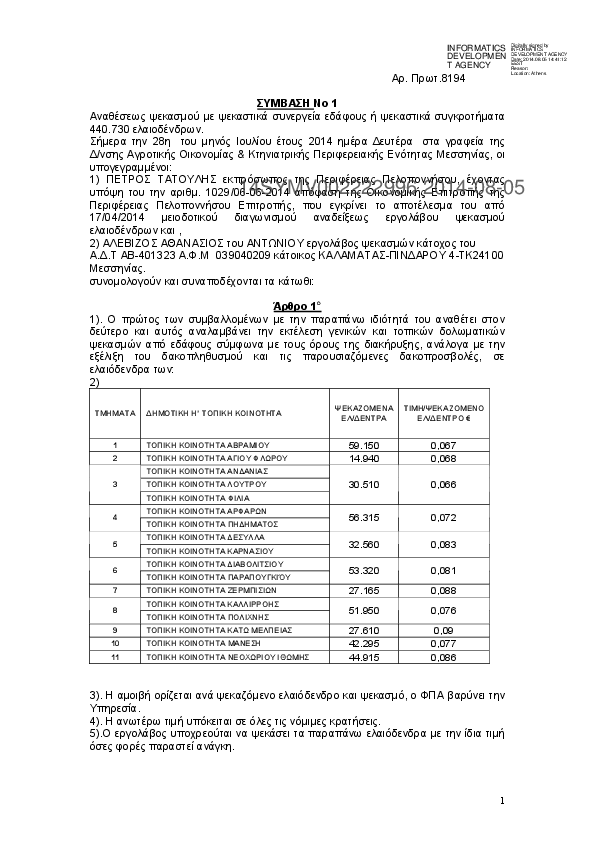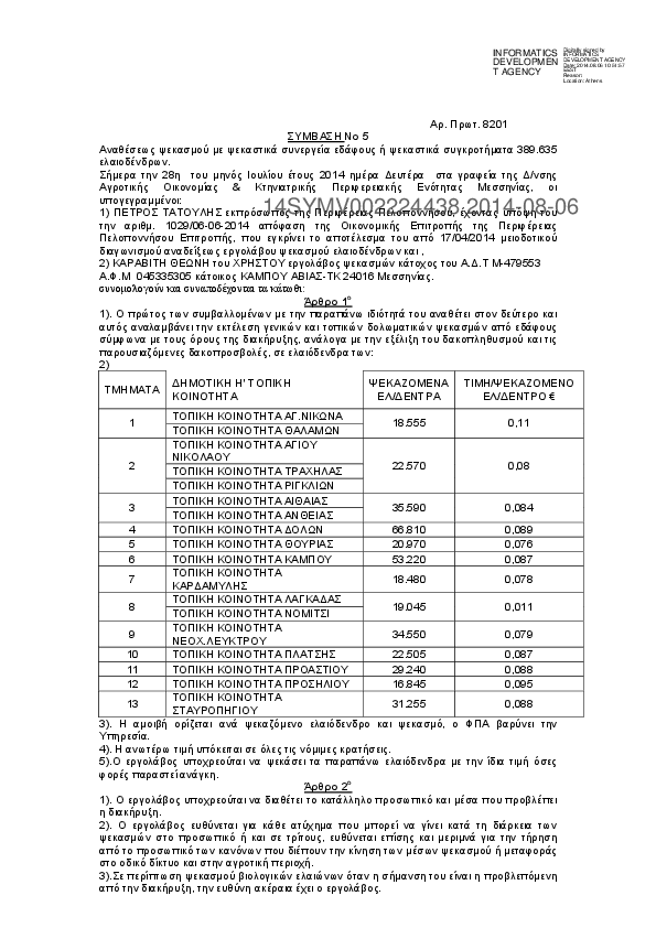 5. Σύμβαση ανάθεσης ψεκασμών Δακοκτονίας 2014 της ΠΕ Μεσσηνίας