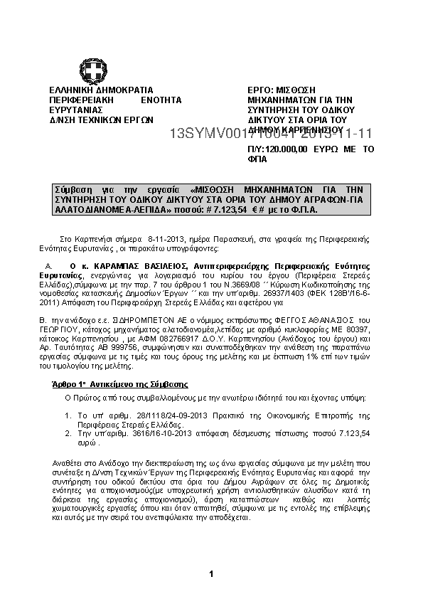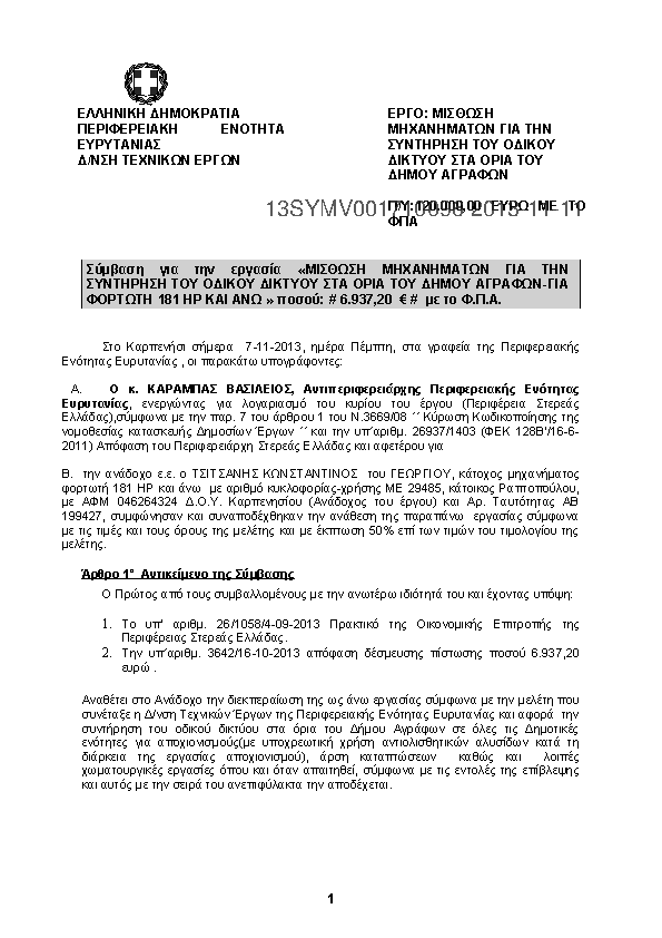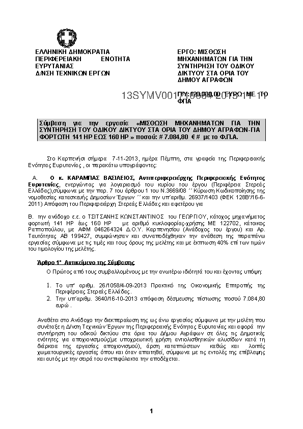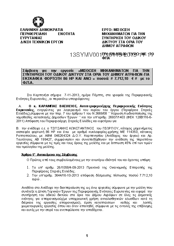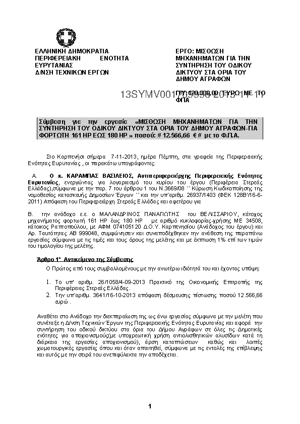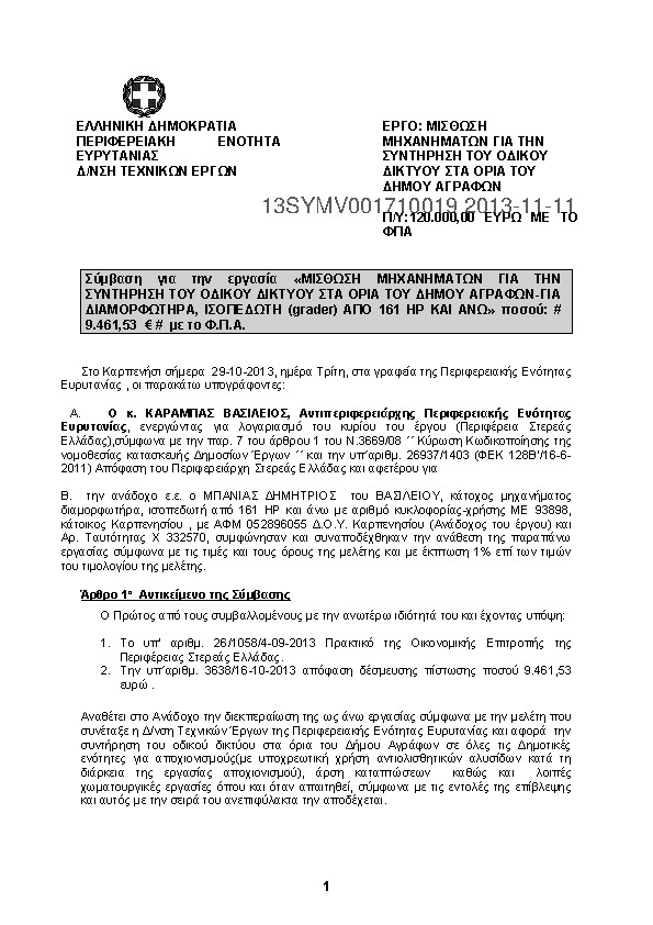 1. ΣΥΜΒΑΣΗ ΓΙΑ ΔΙΑΜΟΡΦΩΤΗΡΑ, ΙΣΟΠΕΔΩΤΗ ΑΠΟ 120 HP ΕΩΣ 160 HP » ποσού: # 9.324,63 € # με το Φ.Π.Α