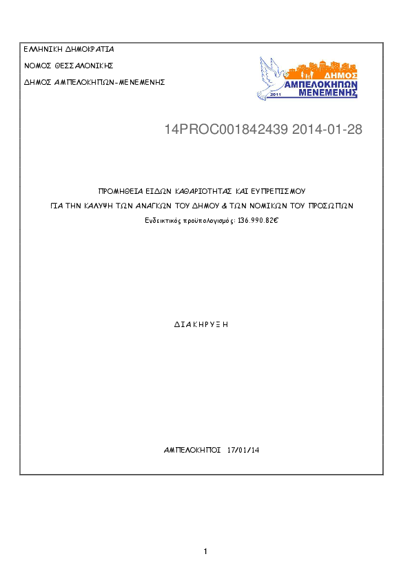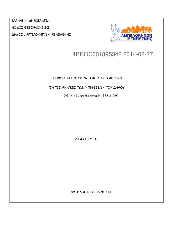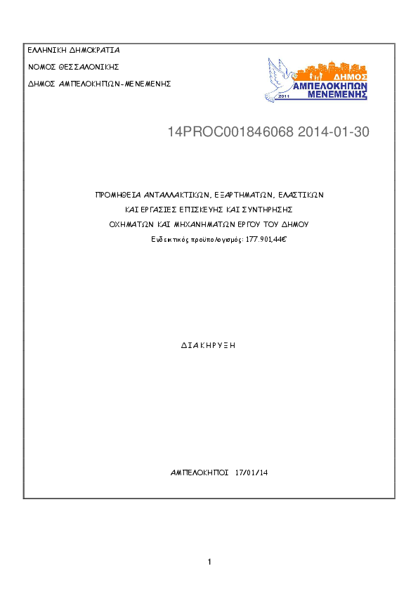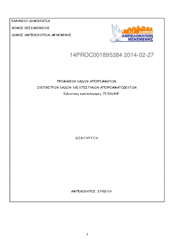2. ΔΙΑΚΗΡΥΞΗ ΑΝΟΙΚΤΟΥ ΔΙΑΓΩΝΙΣΜΟΥ ΓΙΑ ΤΗΝ "ΠΡΟΜΗΘΕΙΑ ΥΓΡΩΝ ΚΑΥΣΙΜΩΝ ΔΗΜΟΥ ΑΜΠΕΛΟΚΗΠΩΝ ΜΕΝΕΜΕΝΗΣ & ΤΩΝ ΝΟΜΙΚΩΝ ΤΟΥ ΠΡΟΣΩΠΩΝ ΓΙΑ ΤΟ ΕΤΟΣ 2014"