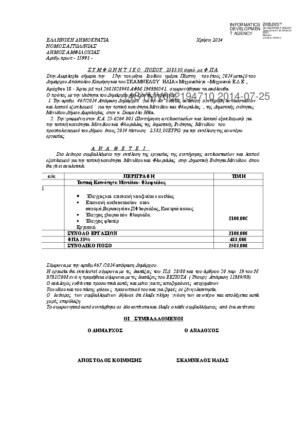 7. Σύμβαση για συντήρηση δικτύου ύδρευσης (Δ.Ε. Μενιδίου)