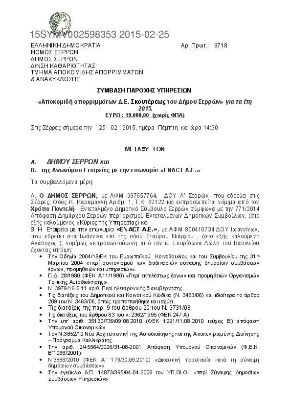 9. «Αποκομιδή απορριμμάτων Δ.Ε. Σκουτάρεως του Δήμου Σερρών» για τα έτη 2015.
