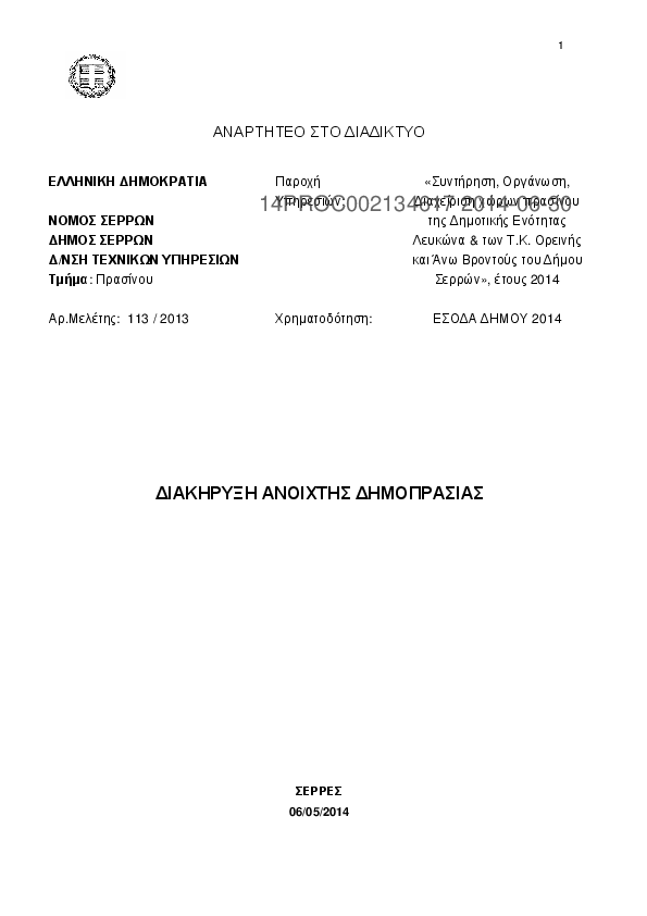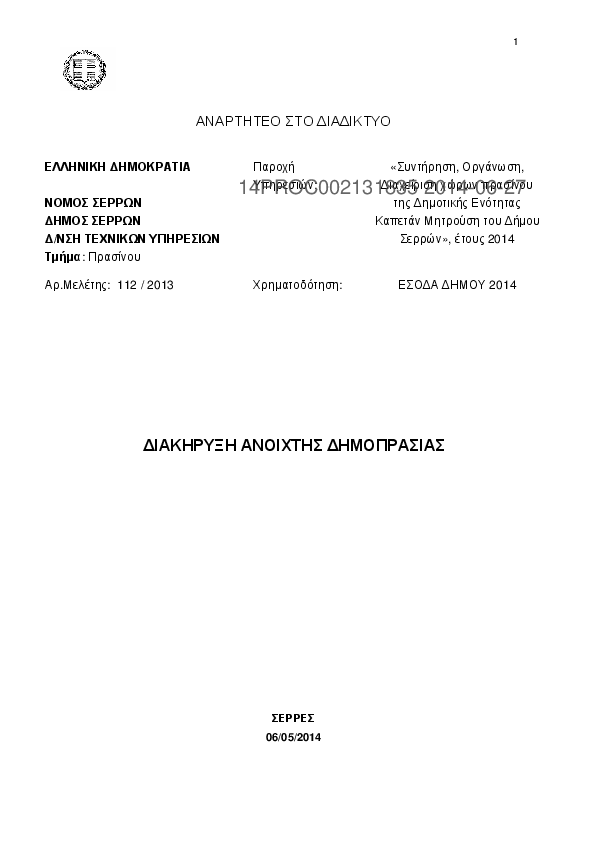 5. Διακήρυξη ανοικτού διαγ π υ :«Συντήρηση, Οργάνωση, Διαχείριση χώρων πρασίνου Δ Ε Κ.Μητρούση Σερρών»,