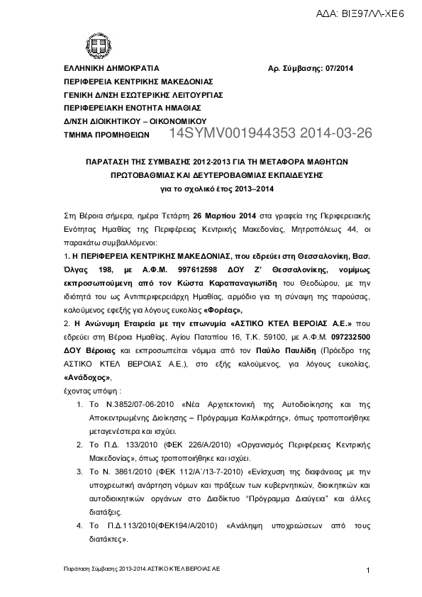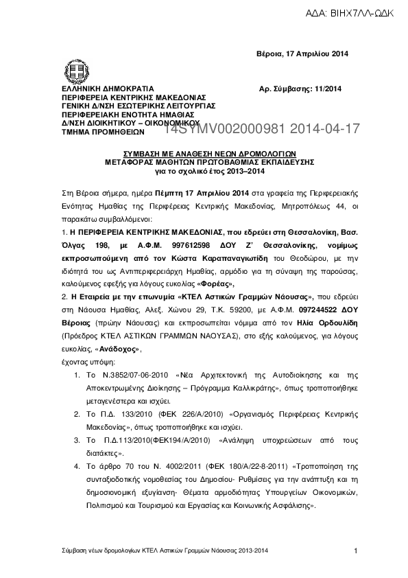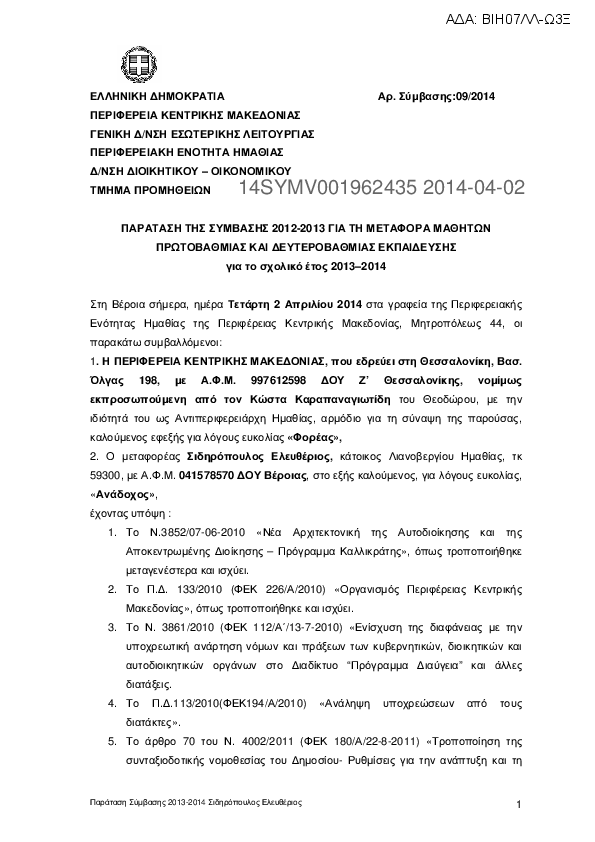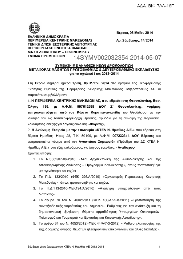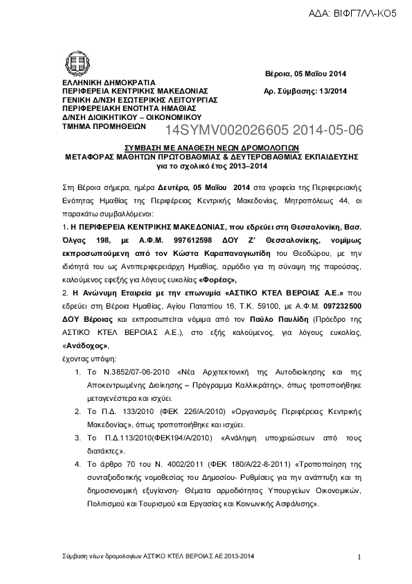 5. ΣΥΜΒΑΣΗ ΜΕ ΑΝΑΘΕΣΗ ΝΕΩΝ ΔΡΟΜΟΛΟΓΙΩΝ ΜΕΤΑΦΟΡΑΣ ΜΑΘΗΤΩΝ ΠΡΩΤΟΒΑΘΜΙΑΣ ΕΚΠΑΙΔΕΥΣΗΣ ΣΧΟΛ. ΕΤΟΥΣ 2013 14-