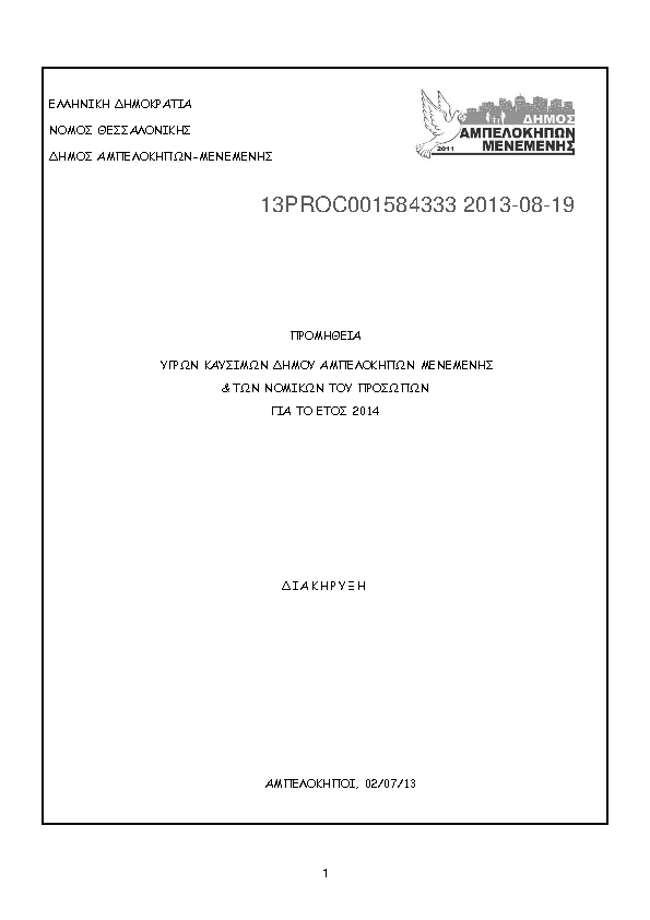 2. ΔΙΑΚΗΡΥΞΗ ΑΝΟΙΚΤΟΥ ΔΙΑΓΩΝΙΣΜΟΥ ΓΙΑ ΤΗΝ "ΠΡΟΜΗΘΕΙΑ ΥΓΡΩΝ ΚΑΥΣΙΜΩΝ ΔΗΜΟΥ ΑΜΠΕΛΟΚΗΠΩΝ ΜΕΝΕΜΕΝΗΣ & ΤΩΝ ΝΟΜΙΚΩΝ ΤΟΥ ΠΡΟΣΩΠΩΝ ΓΙΑ ΤΟ ΕΤΟΣ 2014"