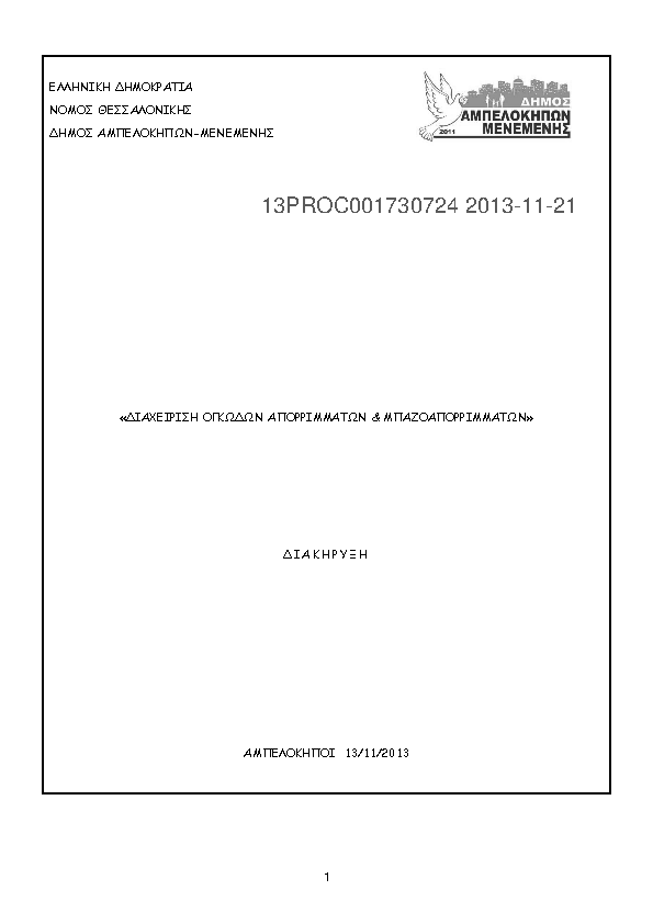1. ΔΙΑΚΗΡΥΞΗ ΠΡΟΧΕΙΡΟΥ ΔΙΑΓΩΝΙΣΜΟΥ ΓΙΑ ΤΗΝ ΑΝΑΘΕΣΗ ΤΩΝ ΥΠΗΡΕΣΙΩΝ ΔΙΑΧΕΙΡΙΣΗΣ ΟΓΚΩΔΩΝ ΑΠΟΡΡΙΜΜΑΤΩΝ & ΜΠΑΖΟΑΠΟΡΡΙΜΜΑΤΩΝ