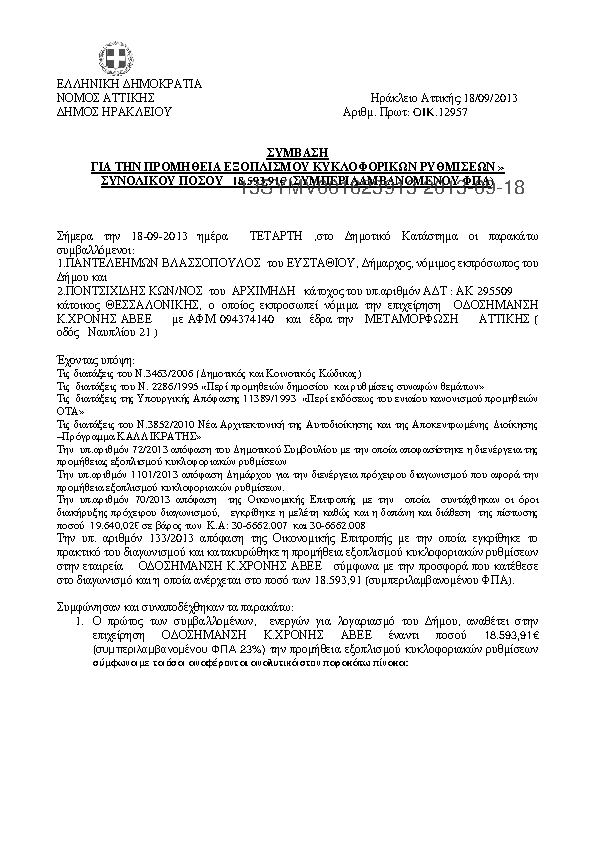 1. ΣΥΜΒΑΣΗ ΓΙΑ ΤΗΝ ΠΡΟΜΗΘΕΙΑ ΕΞΟΠΛΙΣΜΟΥ ΚΥΚΛΟΦΟΡΙΚΩΝ ΡΥΘΜΙΣΕΩΝ