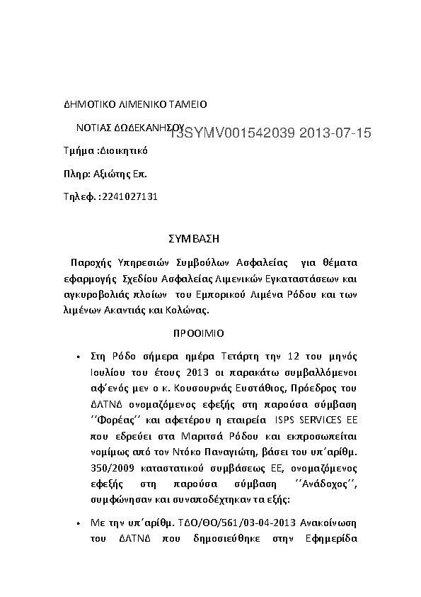 1. Παροχής Υπηρεσιών Συμβούλων Ασφαλείας για θέματα εφαρμογής Σχεδίου Ασφαλείας Λιμενικών Εγκαταστάσ