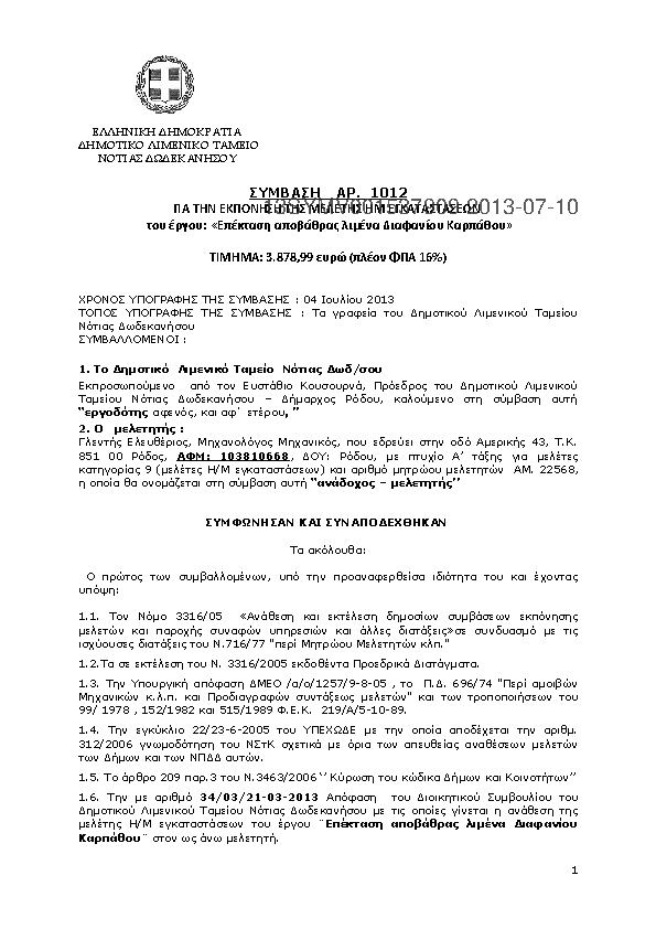 7. ΓΙΑ ΤΗΝ ΕΚΠΟΝΗΣΗ ΤΗΣ ΜΕΛΕΤΗΣ ΗΜ ΕΓΚΑΤΑΣΤΑΣΕΩΝ του έργου: «Επέκταση αποβάθρας λιμένα Διαφανίου Καρπ