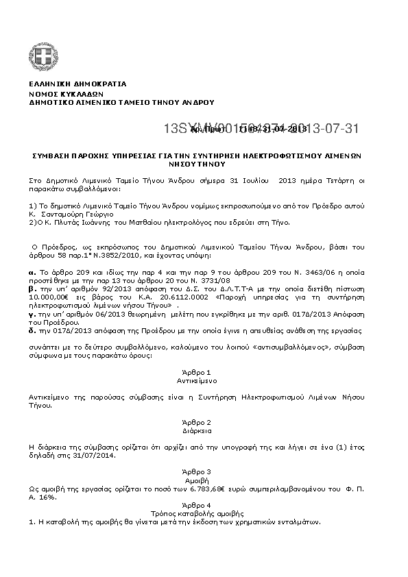 3. Σύμβαση παροχής υπηρεσίας για την συντήρηση ηλεκτροφωτισμού λιμένων νήσου Τήνου
