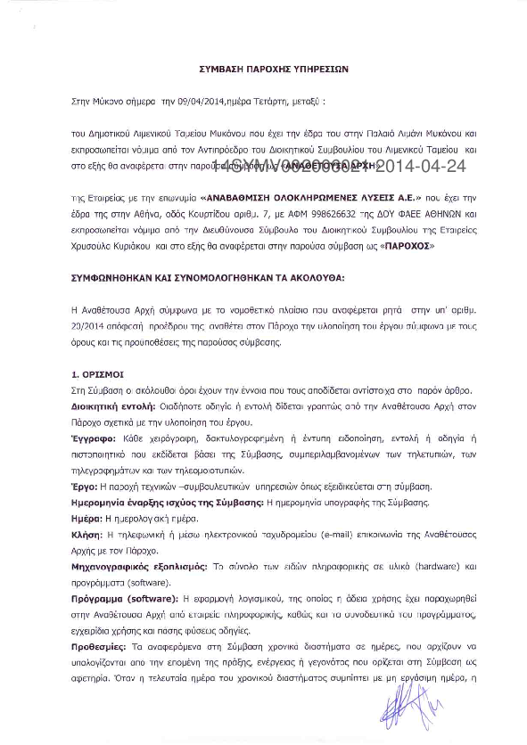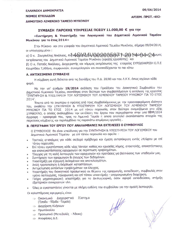 9. Συντήρηση & Υποστήριξη του Λογισμικού του Δημοτικού Λιμενικού Ταμείου Μυκόνου για το έτος 2014.