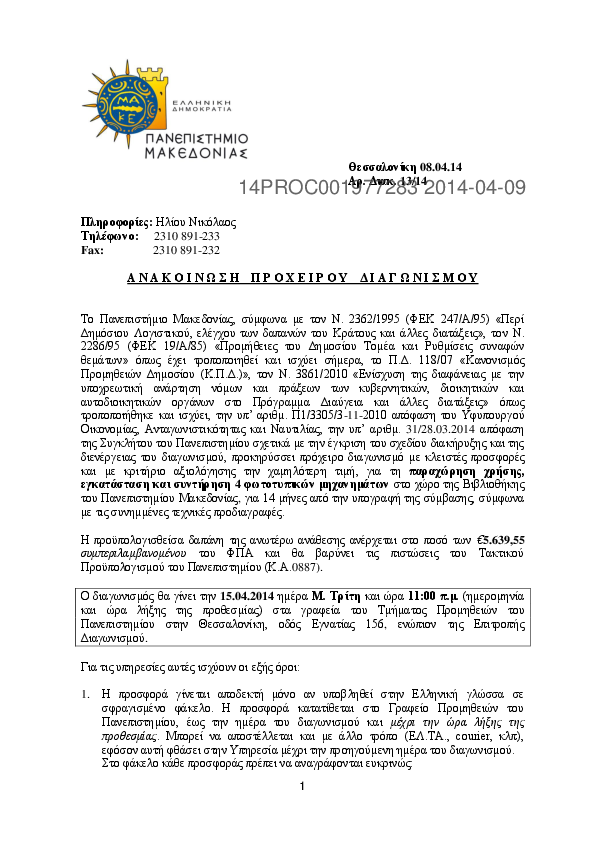 5. 14μηνη μίσθωση/εγκατάσταση και συντήρηση 4 φωτοτυπικών μηχανημάτων στο Πανεπιστήμιο Μακεδονίας