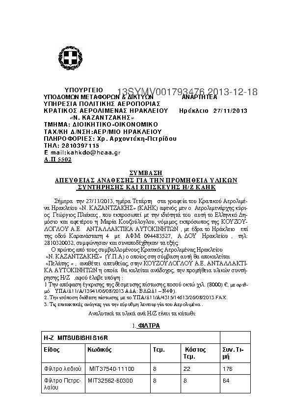 10. ΣΥΜΒΑΣΗ ΑΠΕΥΘΕΙΑΣ ΑΝΑΘΕΣΗΣ ΠΡΟΜΗΘΕΙΑΣ ΥΛΙΚΩΝ ΣΥΝΤΗΡΗΣΗΣ ΚΑΙ ΕΠΙΣΚΕΥΗΣ Η/Ζ ΚΑΗΚ Η/Ζ ΚΑΗΚ
