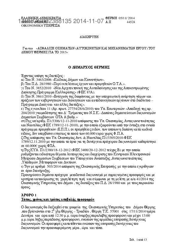 5. «ΑΣΦΑΛΙΣΗ ΟΧΗΜΑΤΩΝ (ΑΥΤΟΚΙΝΗΤΩΝ ΚΑΙ ΜΗΧΑΝΗΜΑΤΩΝ ΕΡΓΟΥ) ΤΟΥ ΔΗΜΟΥ ΘΕΡΜΗΣ ΓΙΑ ΤΟ 2015»