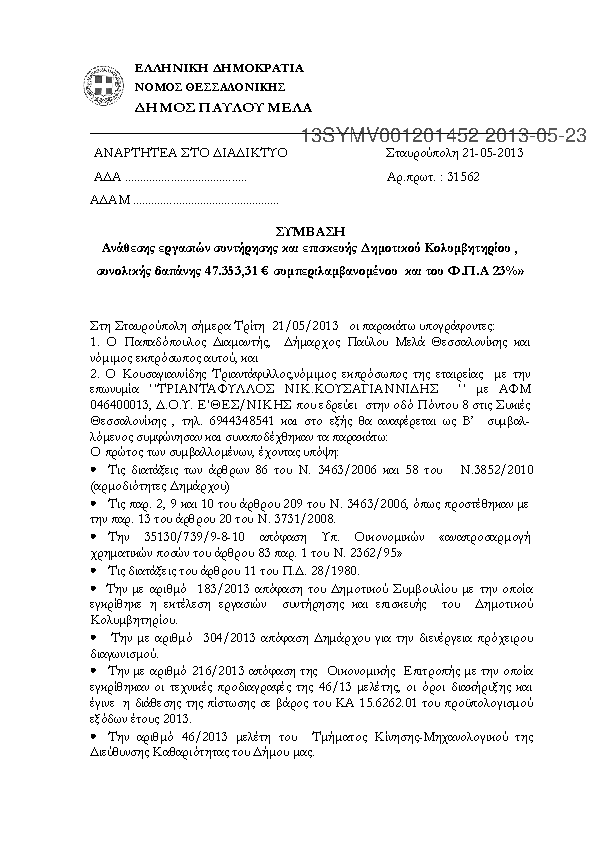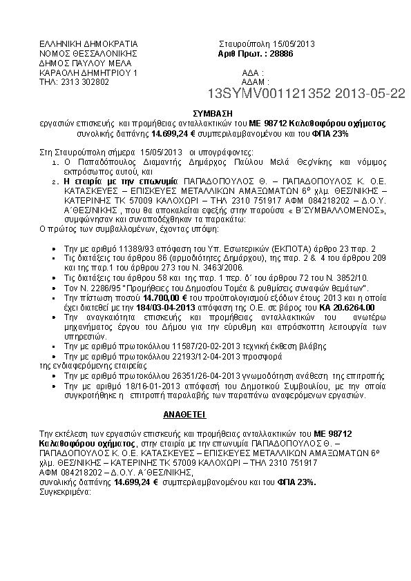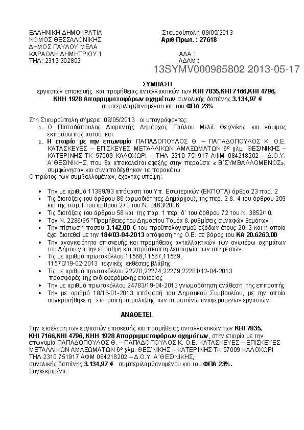 2. ΣΥΜΒΑΣΗ εργασιών επισκευής και προμήθειας ανταλλακτικών του ΜΕ 98712 Καλαθοφόρου οχήματος συνολικής