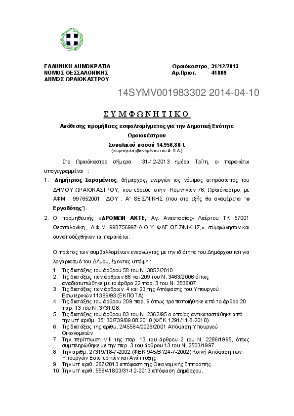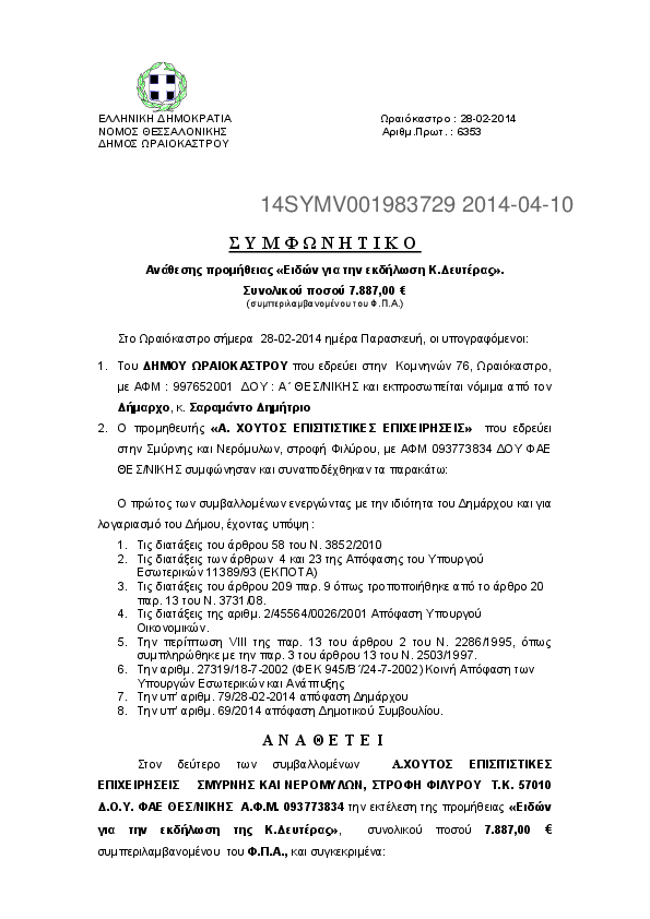 9. ΣΥΜΒΑΣΗ ΠΡΟΜΗΘΕΙΑΣ ΜΗΧΑΝΟΓΡΑΦΙΚΟΥ ΕΞΟΠΛΙΣΜΟΥ ΓΙΑ ΤΙΣ ΥΠΗΡΕΣΙΕΣ ΤΟΥ ΔΗΜΟΥ ΩΡΑΙΟΚΑΣΤΡΟΥ