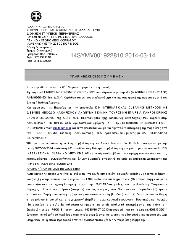 10. Ανάθεση Υπηρεσιών Παροχής Γευμάτων (Τραπεζοκόμων) για τις ανάγκες του Νοσοκομείου Κορίνθου