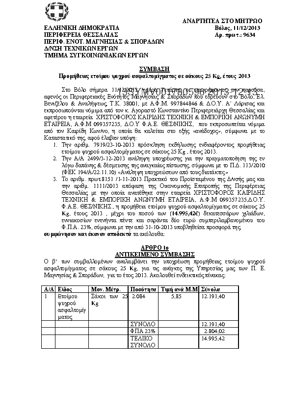 2. ΣΥΜΒΑΣΗ ΠΡΟΜΗΘΕΙΑΣ ΨΥΧΡΟΥ ΑΣΦΑΛΤΟΜΙΓΜΑΤΟΣ ΣΕ ΣΑΚΟΥΣ 25 ΚG, ΕΤΟΥΣ 2013