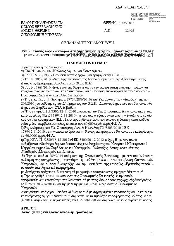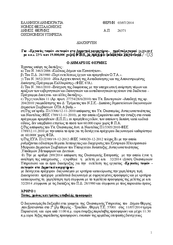 4. 1η επαναληπτική διακήρυξη για εργασίες ταφών εκταφών στα δημοτικά κοιμητήρια του δήμου Θέρμης