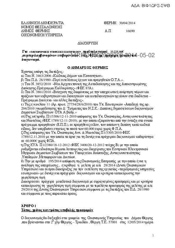 1. Διακήρυξη πρόχειρου διαγωνισμού για την εργασία "Ταχυδρομικές υπηρεσίες εσωτερικού"