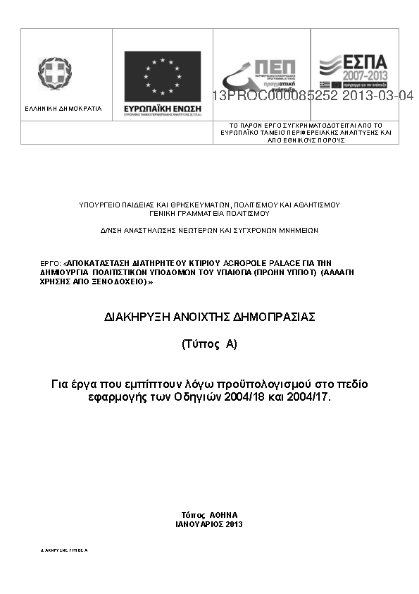 5. Ανακοίνωση Περίληψης Διακήρυξης Σύμβασης «Αποκατάσταση Διατηρητέου κτηρίου Acropole Palace για την Δημιουργία Πολιτιστικών Υποδομών του ΥΠΑΙΘΠΑ (πρώην ΥΠΠΟΤ) (αλλαγή χρήσης από ξενοδοχείο)»