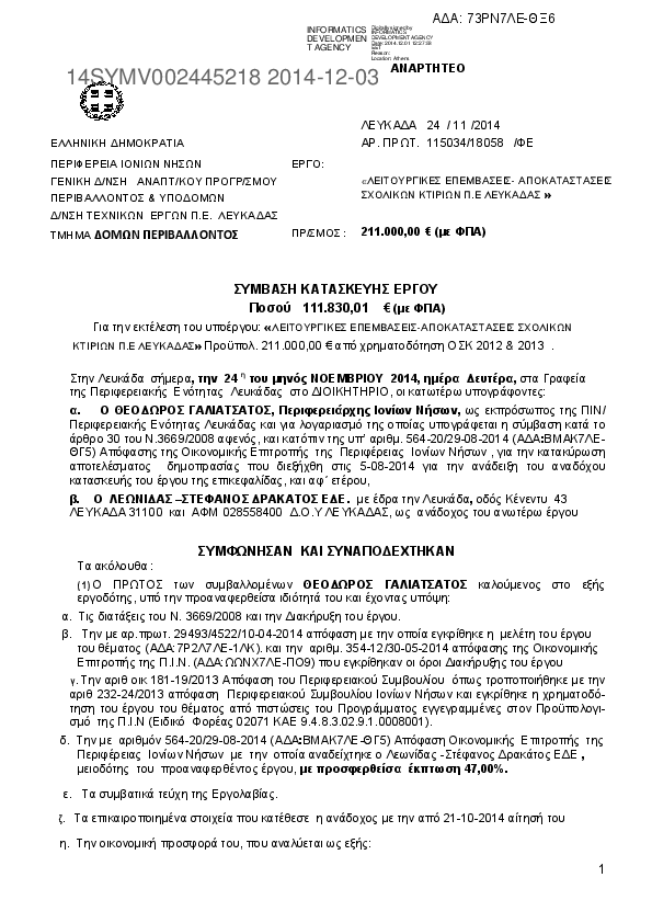 4. ΣΥΜΒΑΣΗ ΚΑΤΑΣΚΕΥΗΣ ΕΡΓΟΥ "ΛΕΙΤΟΥΡΓΙΚΕΣ ΕΠΕΜΒΑΣΕΙΣ - ΑΠΟΚΑΤΑΣΤΑΣΕΙΣ ΣΧΟΛΙΚΩΝ ΚΤΙΡΙΩΝ ΠΕ ΛΕΥΚΑΔΑΣ"