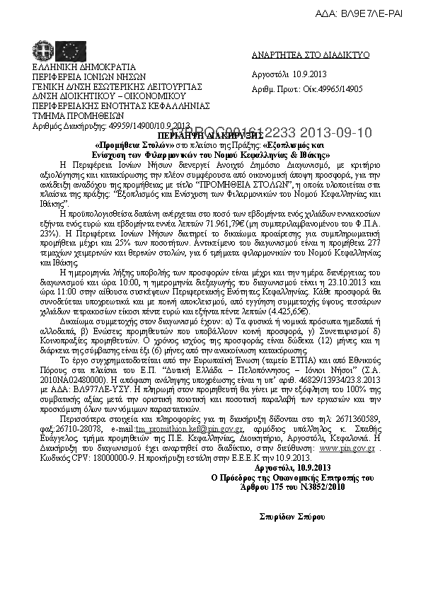1. ΠΕΡΙΛΗΨΗ ΕΠΑΝΑΔΙΑΚΗΡΥΞΗΣ «Προμήθεια Στολών» στο πλαίσιο της Πράξης: «Εξοπλισμός και Ενίσχυση των Φιλαρμονικών του Νομού Κεφαλληνίας & Ιθάκης»