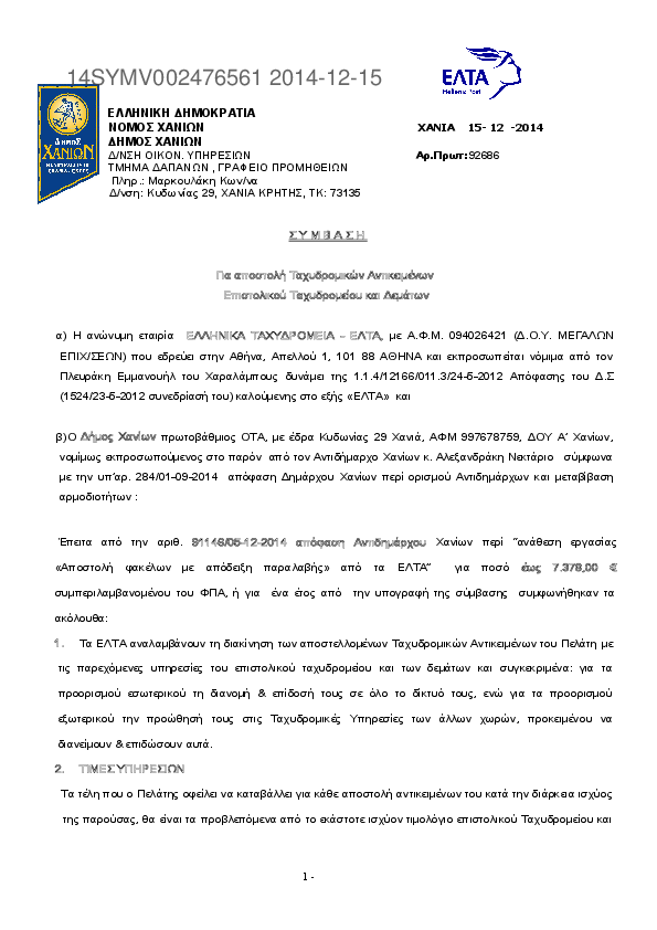 1. «Προμήθεια υλικών για το έργο συντήρηση και επισκευή οδικών δικτύων με ασφαλτικά υλικά, χρήση 2014»