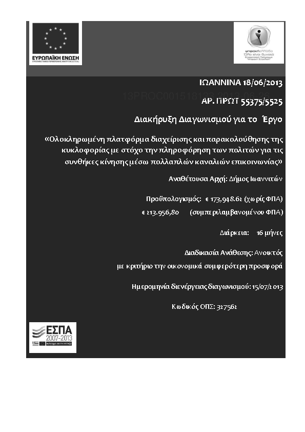 1. Διακήρυξη Διαγωνισμού για το Έργο«Ολοκληρωμένη πλατφόρμα διαχείρισης και παρακολούθησης της κυκλοφορίας με στόχο την πληροφόρηση των πολιτών για τις συνθήκες κίνησης μέσω πολλαπλών καναλιών επικοινωνίας»