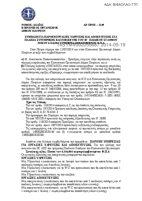 7. ΣΥΜΒΑΣΗ ΠΑΡΟΧΗΣ ΥΠΗΡΕΣΙΑΣ ΓΙΑ ΕΡΓΑΣΙΕΣ ΥΔΡΕΥΣΗΣ ΚΑΙ ΑΠΟΧΕΤΕΥΣΗΣ ΣΤΟΝ ΙΕ΄ ΔΠΣ