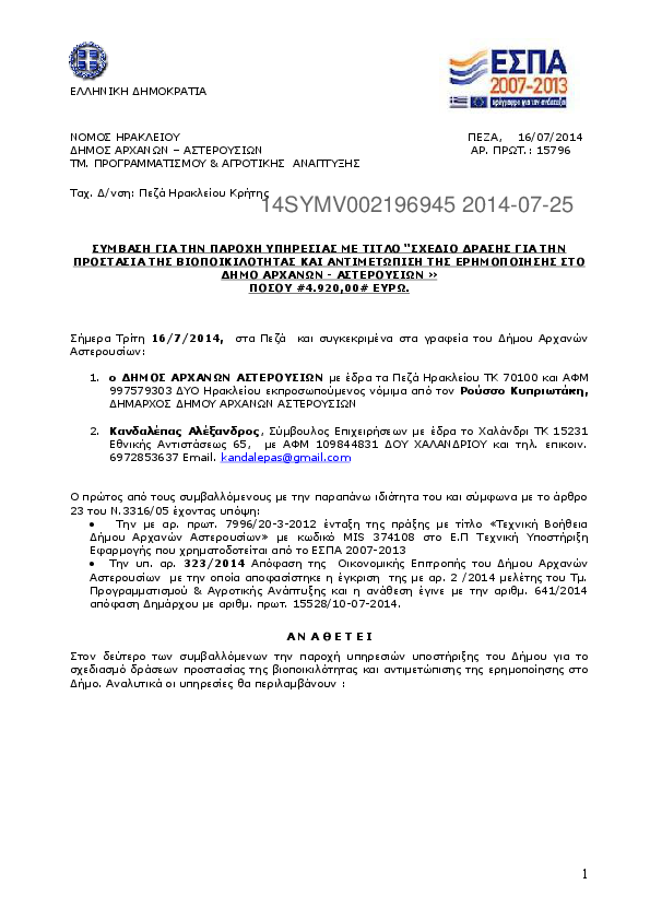 1. ΣΥΜΒ ΓΙΑ ΤΗΝ ΠΑΡ ΥΠΗΡ "ΣΧΕΔ ΔΡΑΣ ΓΙΑ ΤΗΝ ΠΡΟΣΤ ΤΗΣ ΒΙΟΠΟΙΚ ΚΑΙ ΑΝΤΙΜ ΤΗΣ ΕΡΗΜΟΠ ΣΤΟ ΔΗΜΟ ΑΡΧ-ΑΣΤ"