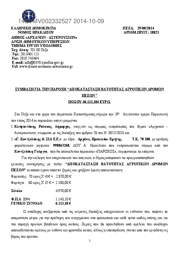 4. ΣΥΜΒΑΣΗ ΓΙΑ ΤΗΝ ΠΑΡΟΧΗ ΥΠΗΡΕΣΙΑΣ ΜΕ ΤΙΤΛΟ “ΑΠΟΚΑΤΑΣΤΑΣΗ ΒΑΤΟΤΗΤΑΣ ΑΓΡΟΤΙΚΩΝ ΔΡΟΜΩΝ ΠΕΖΩΝ ”