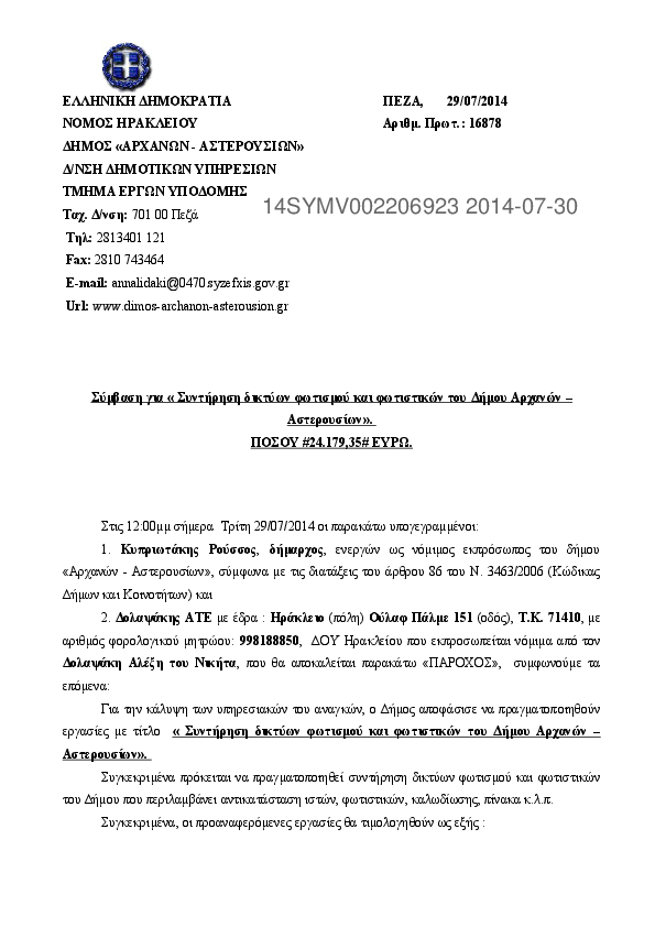 2. Σύμβαση για « Συντήρηση δικτύων φωτισμού και φωτιστικών του Δήμου Αρχανών – Αστερουσίων»