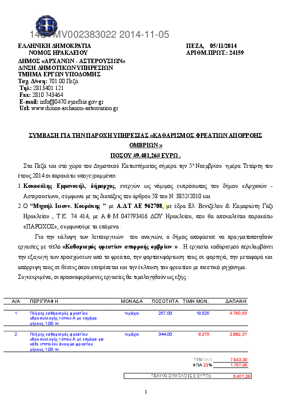8. ΣΥΜΒΑΣΗ ΓΙΑ ΤΗΝ ΠΑΡΟΧΗ ΥΠΗΡΕΣΙΑΣ ΜΕ ΤΙΤΛΟ “ΚΑΘΑΡΙΣΜΟΣ – ΔΙΕΥΘΕΤΗΣΗ ΡΕΜΑΤΟΣ ΑΣΤΡΑΚΩΝ”