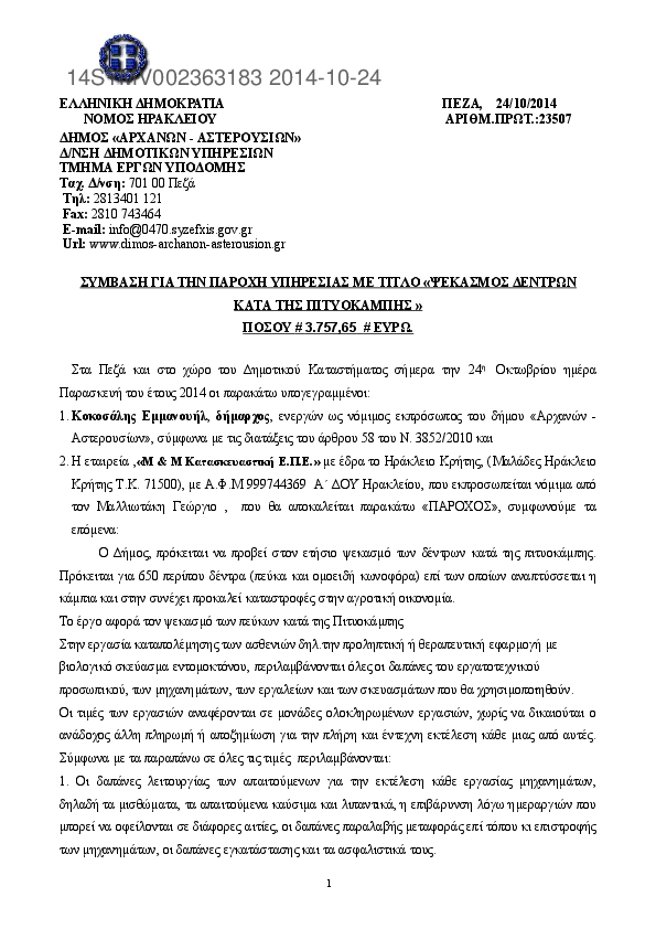 5. ΣΥΜΒΑΣΗ ΓΙΑ ΤΗΝ ΠΑΡΟΧΗ ΥΠΗΡΕΣΙΑΣ ΜΕ ΤΙΤΛΟ «ΨΕΚΑΣΜΟΣ ΔΕΝΤΡΩΝ ΚΑΤΑ ΤΗΣ ΠΙΤΥΟΚΑΜΠΗΣ »