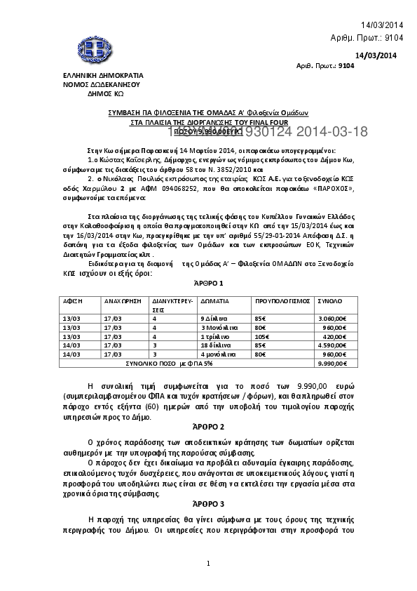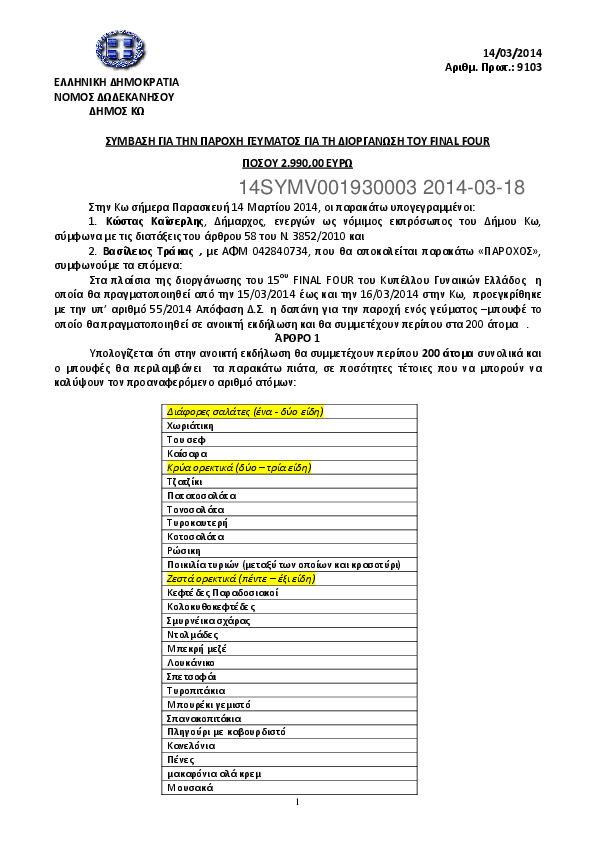 10. Σύμβαση για την παροχή γεύματος στα πλαίσια της διοργάνωσης FINAL FOUR