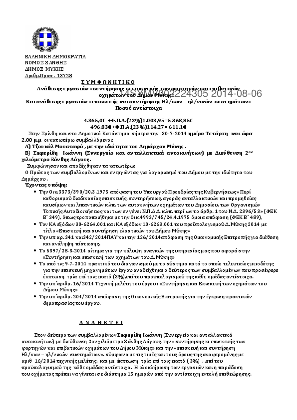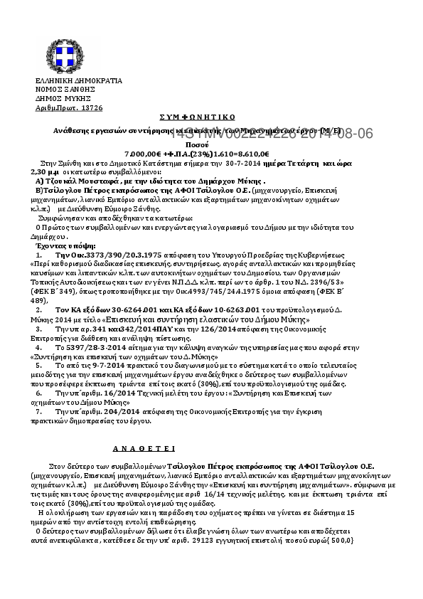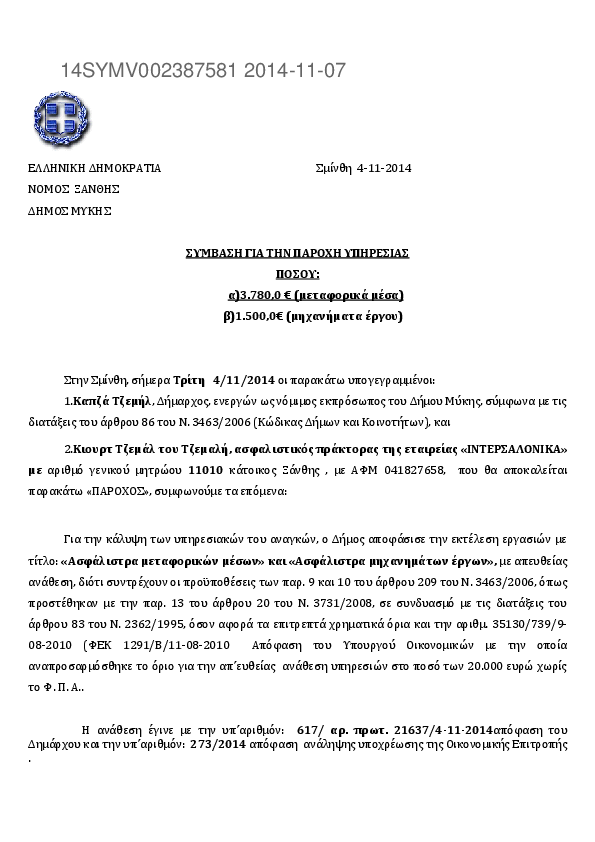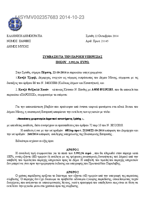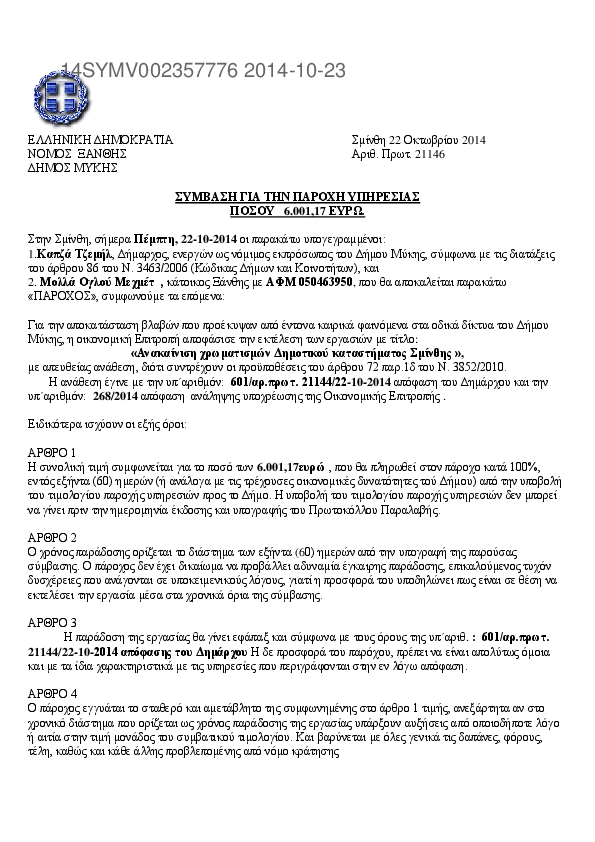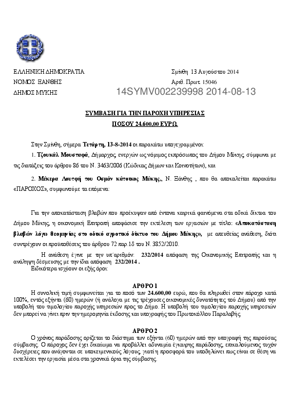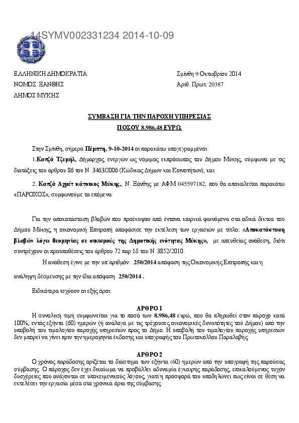 4. ΣΥΜΒΑΣΗ ΓΙΑ ΤΗΝ ΠΑΡΟΧΗ ΥΠΗΡΕΣΙΑΣΑποκατάσταση βλαβών λόγω θεομηνίας σε οικισμούς της Δ.Ε. Μύκης"