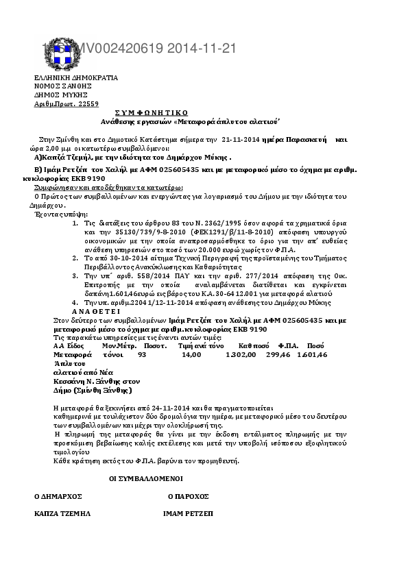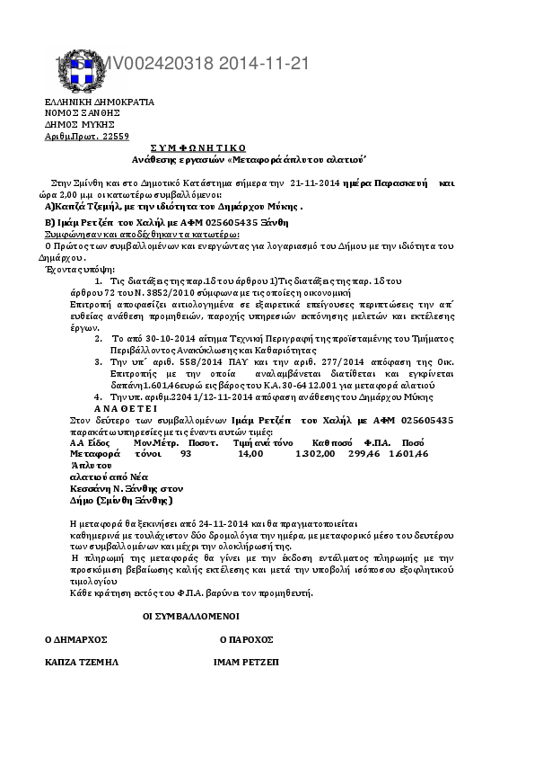 8. Σ Υ Μ Φ Ω Ν Η Τ Ι Κ Ο Ανάθεσης εργασιών «Mεταφορά άπλυτου αλατιού’