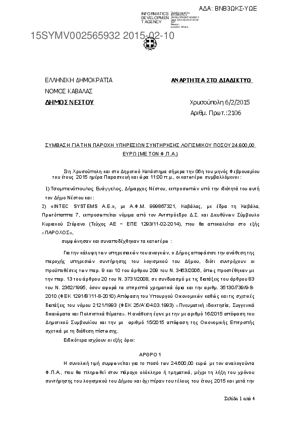 4. ΣΥΜΒΑΣΗ ΓΙΑ ΤΗΝ ΠΑΡΟΧΗ ΥΠΗΡΕΣΙΑΣ ΠΟΣΟΥ 19.332,61 ΕΥΡΩ (ME TON Φ.Π.Α.)