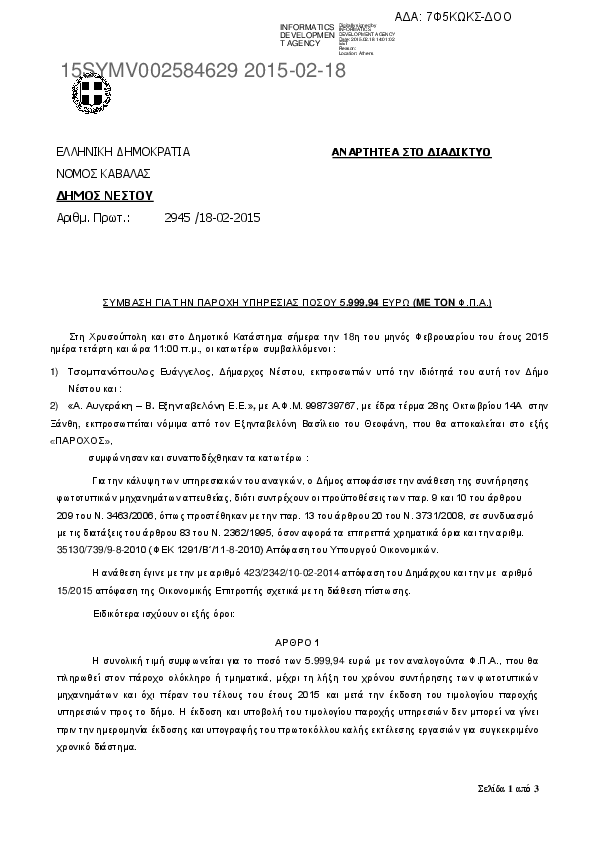 3. ΣΥΜΒΑΣΗ ΓΙΑ ΤΗΝ ΠΑΡΟΧΗ ΥΠΗΡΕΣΙΑΣ ΠΟΣΟΥ 5.000,00 ΕΥΡΩ (ME TON Φ.Π.Α.)
