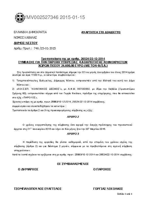 7. ΤΡΟΠΟΠΟΙΗΣΗ ΣΥΜΒΑΣΗΣ ΓΙΑ ΤΗΝ ΠΑΡΟΧΗ ΥΠΗΡΕΣΙΑΣ ΚΑΘΑΡΙΟΤΗΤΑΣ ΚΟΙΝΟΧΡΗΣΤΩΝ ΧΩΡΩΝ ΠΟΣΟΥ 24.600,00 ΕΥΡΩ