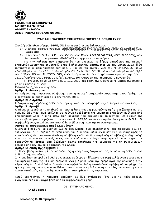 4. Σύμβαση για την παροχή υπηρεσιών λογιστικής υποστήριξης διπλογραφικού συστήματος χρήσης 2013