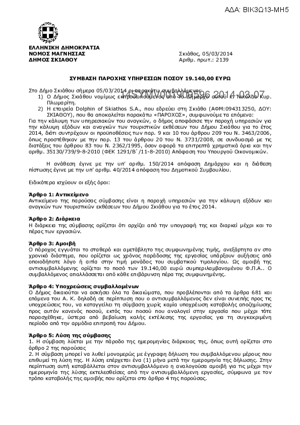 9. ΣΥΜΒΑΣΗ ΓΙΑ ΤΗΝ ΠΑΡΟΧΗ ΥΠΗΡΕΣΙΑΣ ΠΟΣΟΥ 5.000,00 ΕΥΡΩ