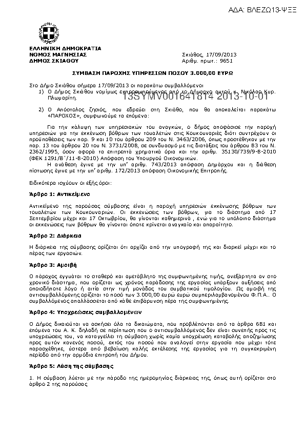 5. Σύμβαση παροχής υπηρεσιών εκκενώσεων βόθρων των τουαλετών στην παραλία των Κουκουναριών
