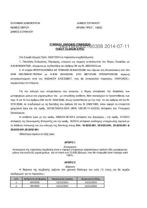 8. ΣΥΜΒΑΣΗ ΠΑΡΟΧΗΣ ΥΠΗΡΕΣΙΩΝ ΓΙΑ ΑΣΦΑΛΙΣΗ ΜΕΤΑΦΟΡΙΚΩΝ ΜΕΣΩΝ & ΜΗΧΑΝΗΜΑΤΩΝ ΤΟΥ ΔΗΜΟΥ ΣΟΥΦΛΙΟΥ