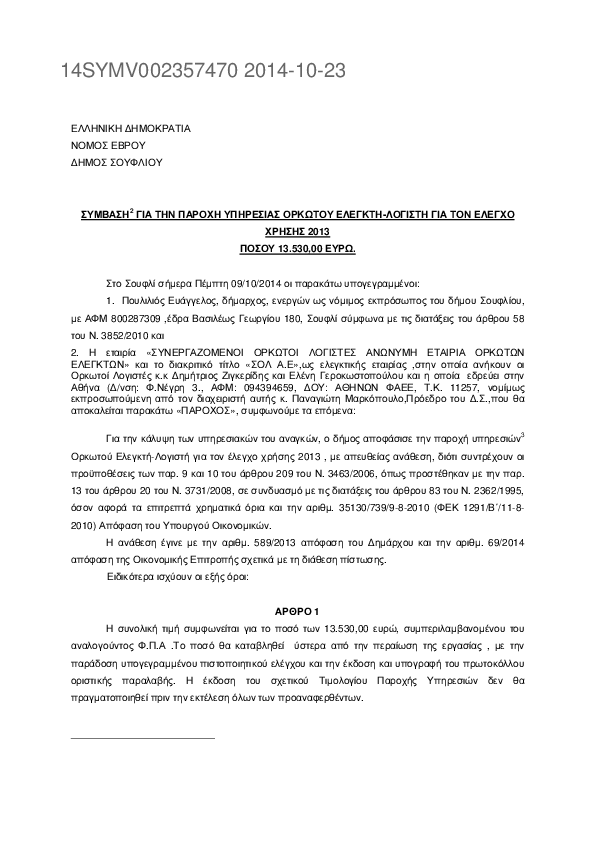 7. ΣΥΜΒΑΣΗ ΓΙΑ ΤΗΝ ΠΑΡΟΧΗ ΥΠΗΡΕΣΙΑΣ ΟΡΚΩΤΟΥ ΕΛΕΓΚΤΗ-ΛΟΓΙΣΤΗ ΓΙΑ ΤΟΝ ΕΛΕΓΧΟ ΧΡΗΣΗΣ 2013