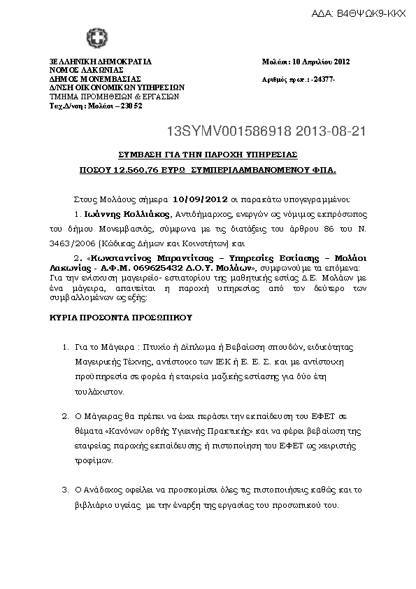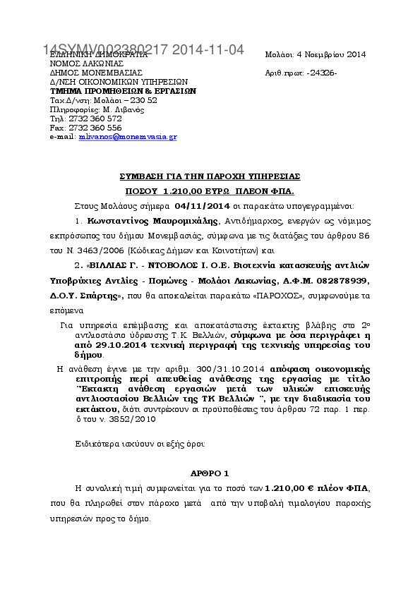 8. Παροχή υπηρεσιών αποκατάστασης βλαβών δικτύων ύδρευσης ΔΕ Μολάων-Ασωπού-Μονεμβασίας-Ζάρακα